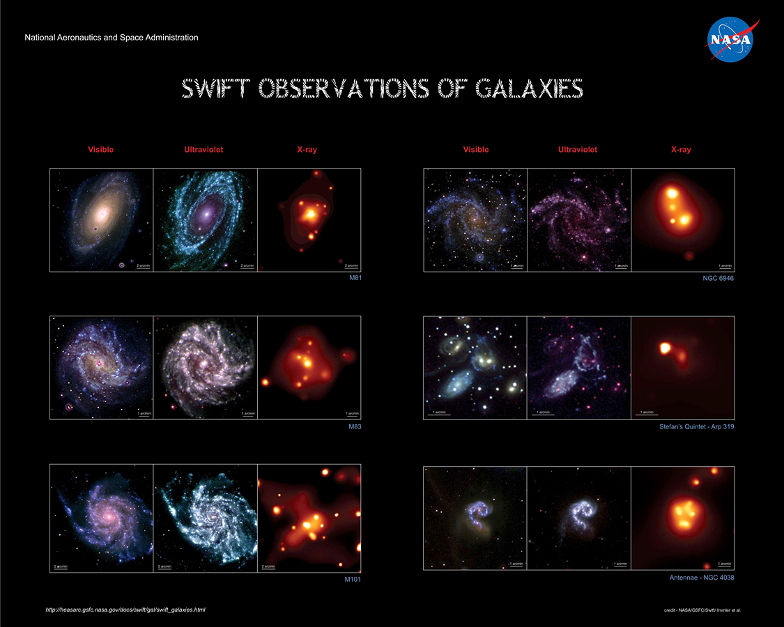 Swift's multiwavelength observations of galaxies. Credit: High Energy Astrophysics Science Archive Research Center (HEASARC), Dr. Andy Ptak (Director), within the Astrophysics Science Division (ASD) at NASA/GSFC
