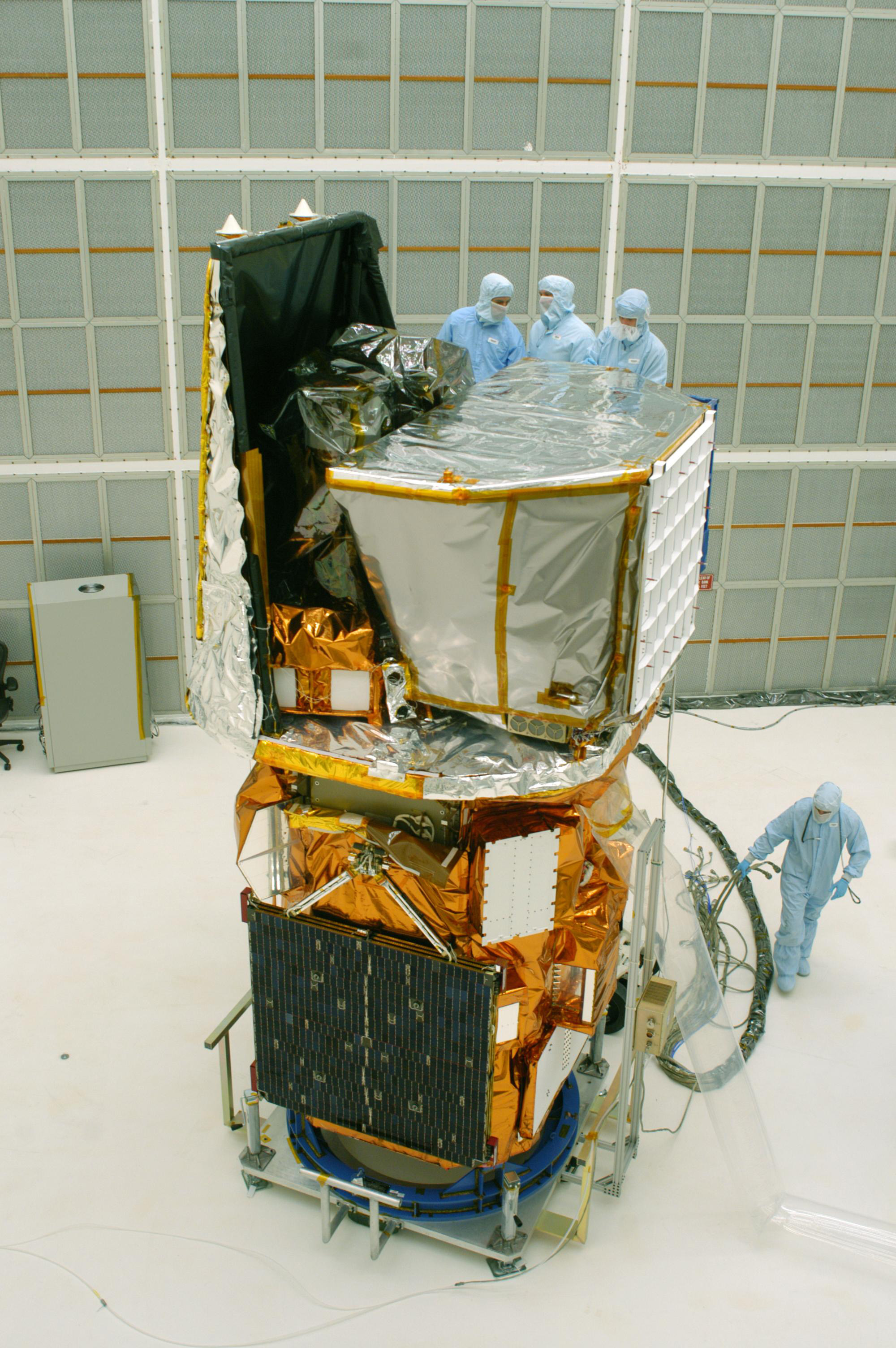 In Hangar AE at Cape Canaveral Air Force Station, Spectrum Astro workers look at the final pieces of protective cover on the Swift spacecraft that must be removed. Credit: NASA's Goddard Space Flight Center