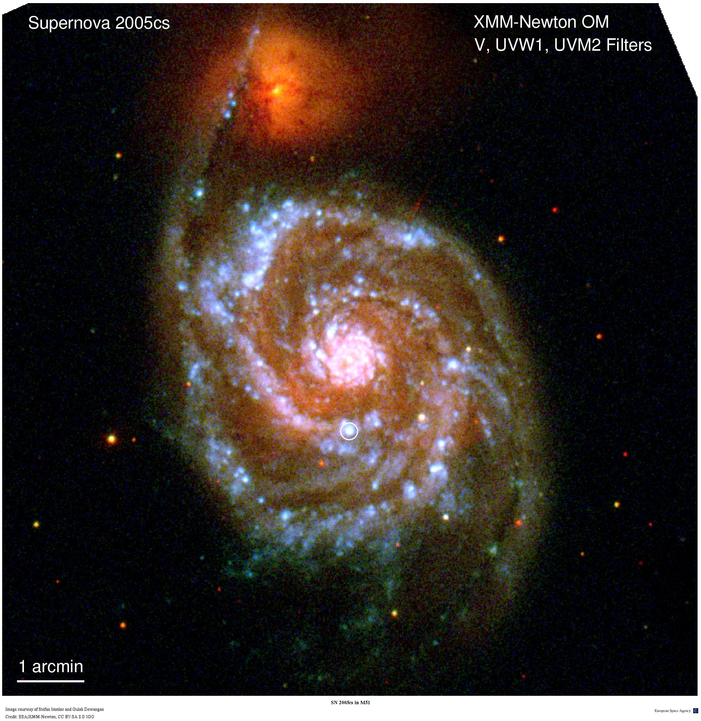 OM image of SN 2005cs, a Type II supernova in the nearby galaxy M51 observed as a Target of Opportunity on the 1st of July, 2005. The image is a false-colour image created by combining the Visible and Ultraviolet images. In the ultraviolet light, the supernova is far brighter than the galaxy's nucleus. Image courtesy of Stefan Immler, Gulab Dewangan, and ESA. Credit: ESA/XMM-Newton,