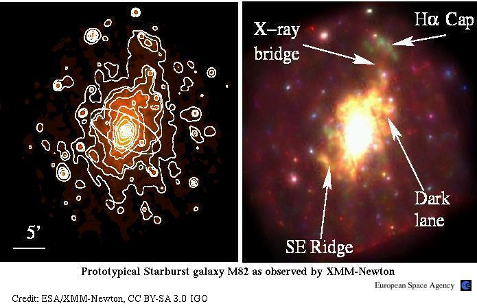 Left: The XMM-Newton view of M82. An adaptively smoothed and exposure-corrected image of the merged data from the MOS1, MOS2 and PN instruments in the 0.2 -10 keV waveband. The extent of the optical galaxy is shown by the ellipse (11.2×4.3 arcmin). Contours are shown to highlight the low surface brightness emission and are increased by a factor of 2. Right: The three-colour EPIC image of M82. The 0.2-0.5 keV, 0.5 -0.9 keV, and 0.9 -2.0 keV bands are shown in red, green, and blue, respectively. Image courtesy of I.R. Stevens, School of Physics and Astronomy, University of Birmingham, UK and ESA. Credit: ESA/XMM-Newton,