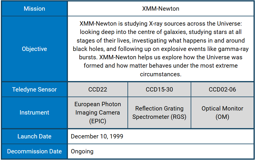 Teledyne Space Imaging produced the CCD detectors deployed on all the spectrometers and imaging instruments on the mission. Optimised to detect emission features from extended and diffuse extragalactic sources, this high sensitivity and wide field of view, equivalent to the apparent size of the Moon as seen from Earth, enabled XMM-Newton to record 6.6 million UV and visible sources and 1 million X-ray sources as of May 2024.