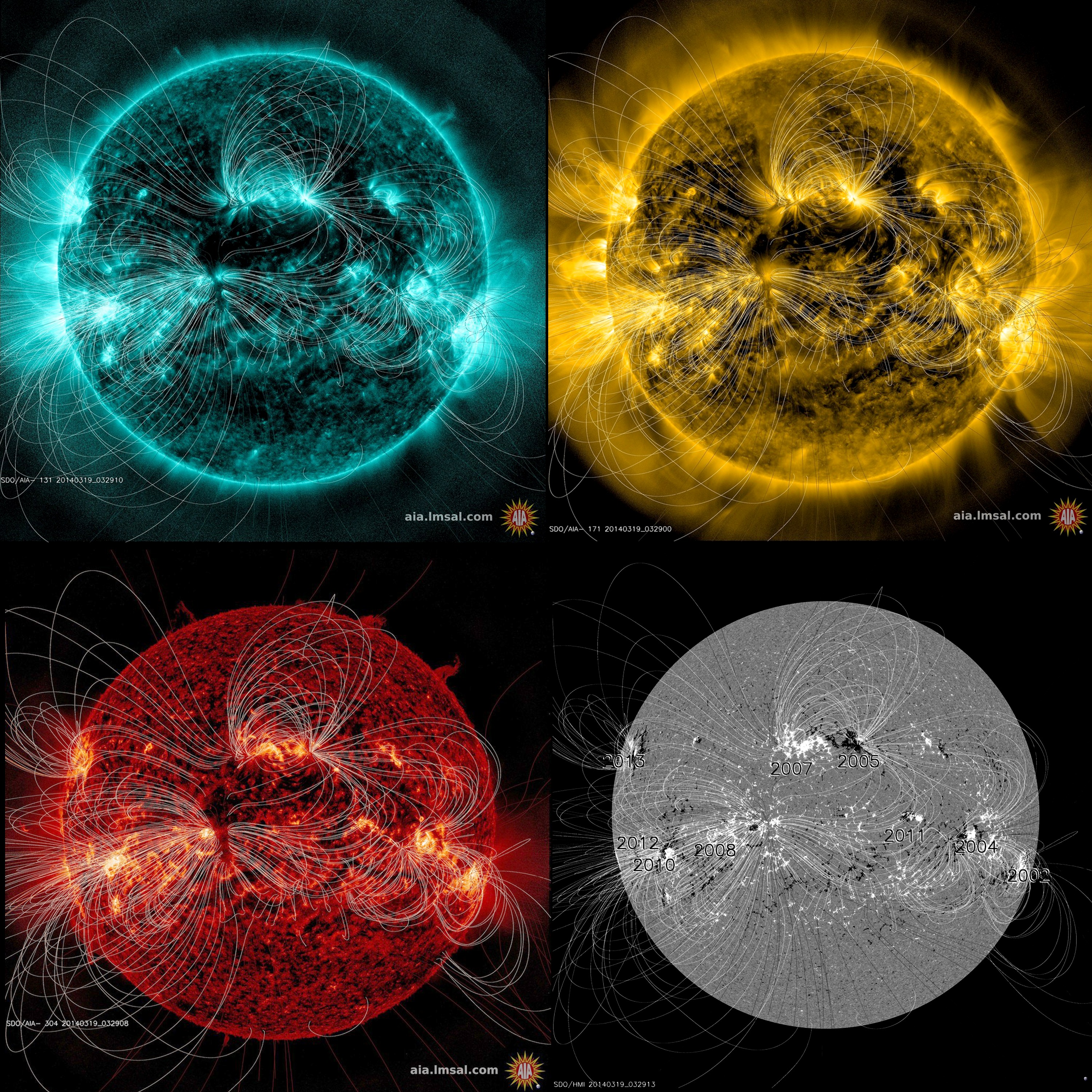 The solar magnetic field is generated inside the sun and emerges on the surface, which creates loops, dark cornal holes and bright spots. These images indicate how these field lines reach high above the Sun, and connect the two magnetic poles of active regions (which appear brighter in the extreme UV images and black and white in the magnetogram image) with other active regions as well.  Black is where the magnetic field is pointing towards the Sun, and white is where the magnetic field is pointing away from the Sun. However, most of the Sun is covered by tiny magnetic field elements, which connect to the "quiet" features seen in the coronal image. Credit: NASA