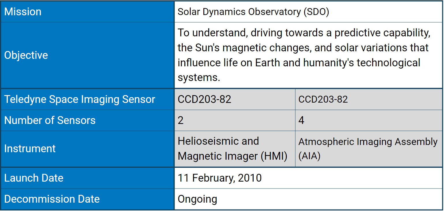 SDO achieved full mission success in September 2015, and is currently in the second round of mission extensions projecting into 2030. With well over 6,000 publications, SDO has demonstrated a great impact on the field of heliphysics. SDO has worked closely with other NASA solar observing missions outfitted with Teledyne Space Imaging sensors, STEREO and PUNCH. STEREO–Solar Terrestrial Relations Observatory–consists of two spacecraft, A and B, which monitor the space between the sun and Earth for solar storms. PUNCH–Polarimeter to Unify the Corona and Heliosphere–will directly observe how the Sun's atmosphere transitions to the solar wind.​