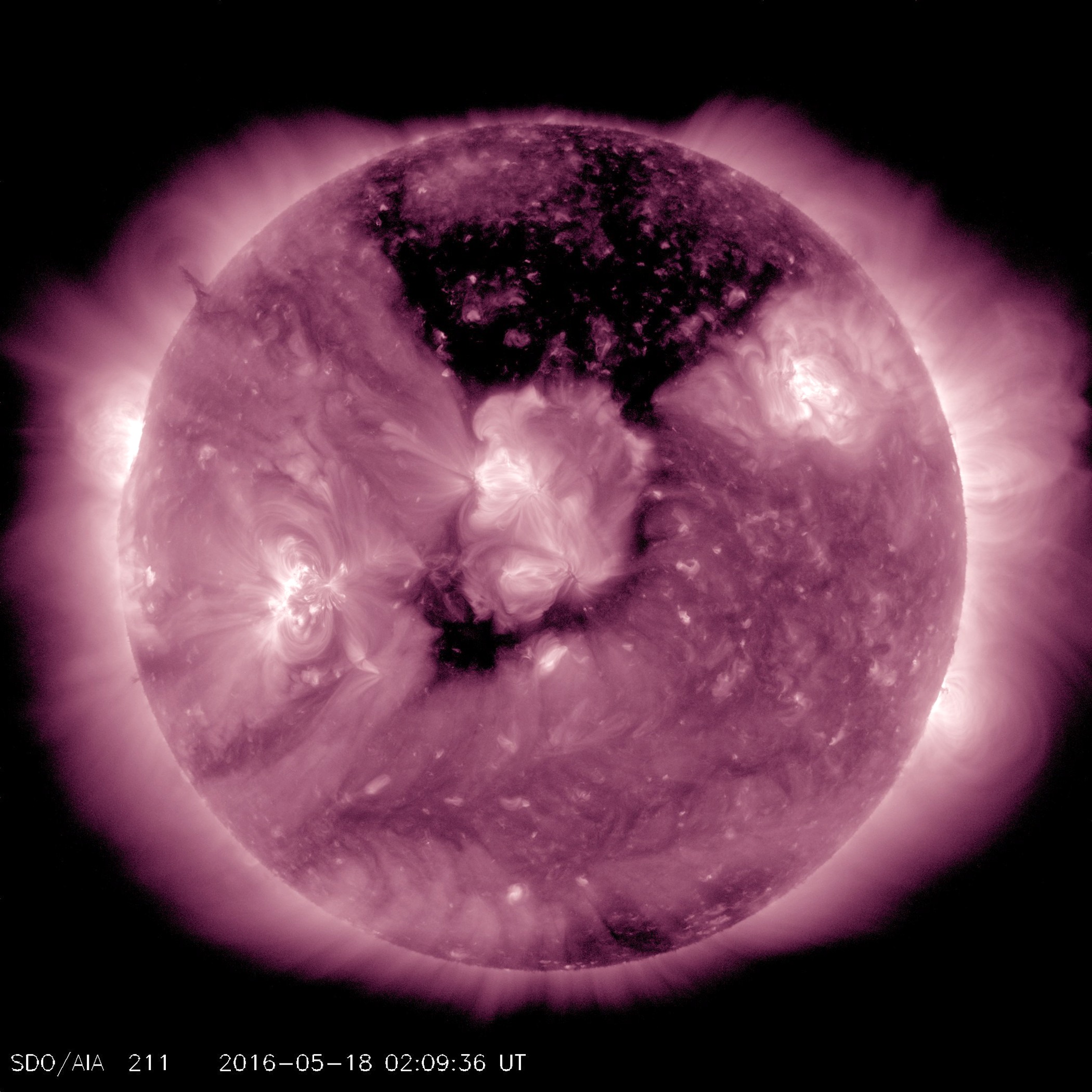 At times, the Sun’s surface is marked by large dark patches called coronal holes where extreme ultraviolet emission is low. Coronal holes are also magnetically open areas generating high-speed solar wind streams into space. Linked to the Sun’s magnetic field, the holes follow the solar cycle, increasing at the solar maximum. When they form at the top and the bottom on the Sun they’re called polar coronal holes and SDO scientists were able to use their disappearance to determine when the Sun’s magnetic field reversed — a key indicator of when the Sun reaches solar maximum.