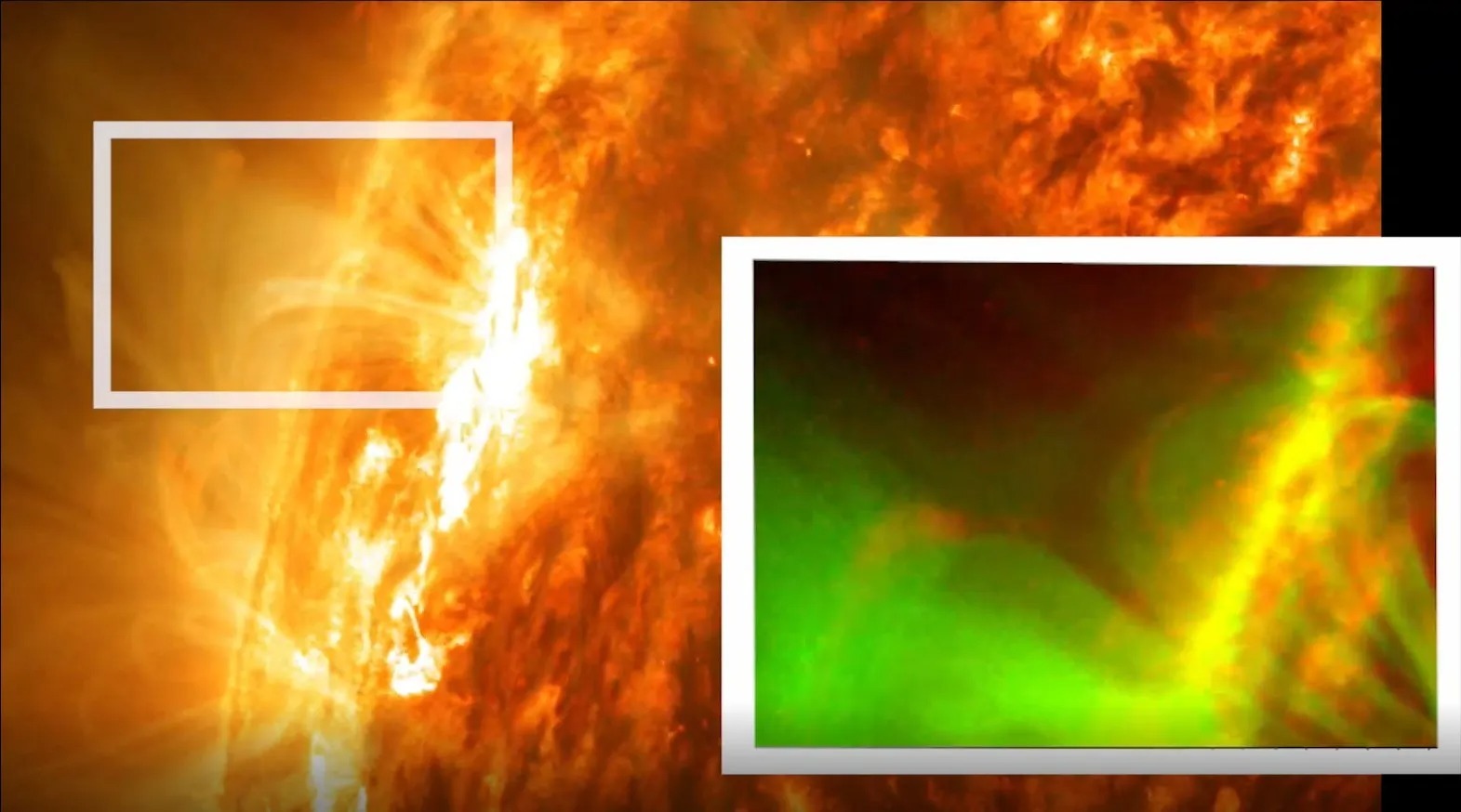 ​Imaged for the first time, a forced magnetic reconnection is caused by a prominence from the Sun. The inset shows a close-up of the reconnection event imaged by SDO’s Atmospheric Imaging Assembly instrument, where the signature X-shape is visible. Credit: NASA/SDO/Abhishek Srivastava/IIT(BHU)​​