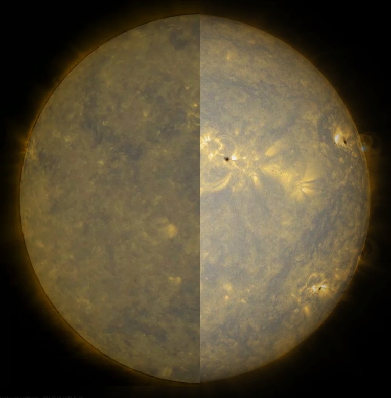​The right side of this image taken July of 2011 displays significantly more solar activity than the left side taken March of 2017. Credit: NASA