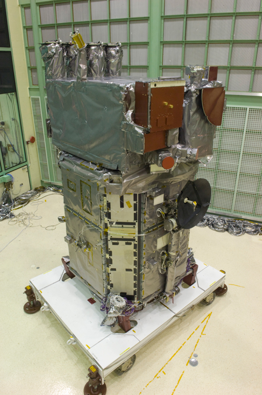 Fully assembled SDO observatory. The four telescopes of the AIA protrude over the top of the satellite. The HMI is seen on the top right corner with the semi-circular plates. Credit: NASA